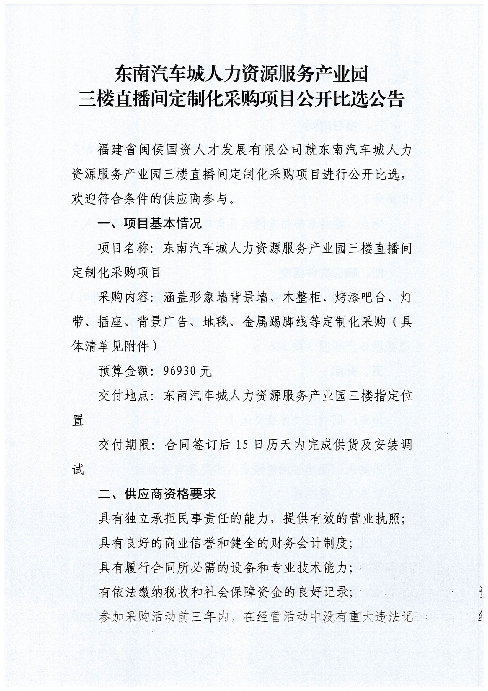 东南汽车城人力资源服务产业园三楼直播间定制化采购项目公开比选公告
