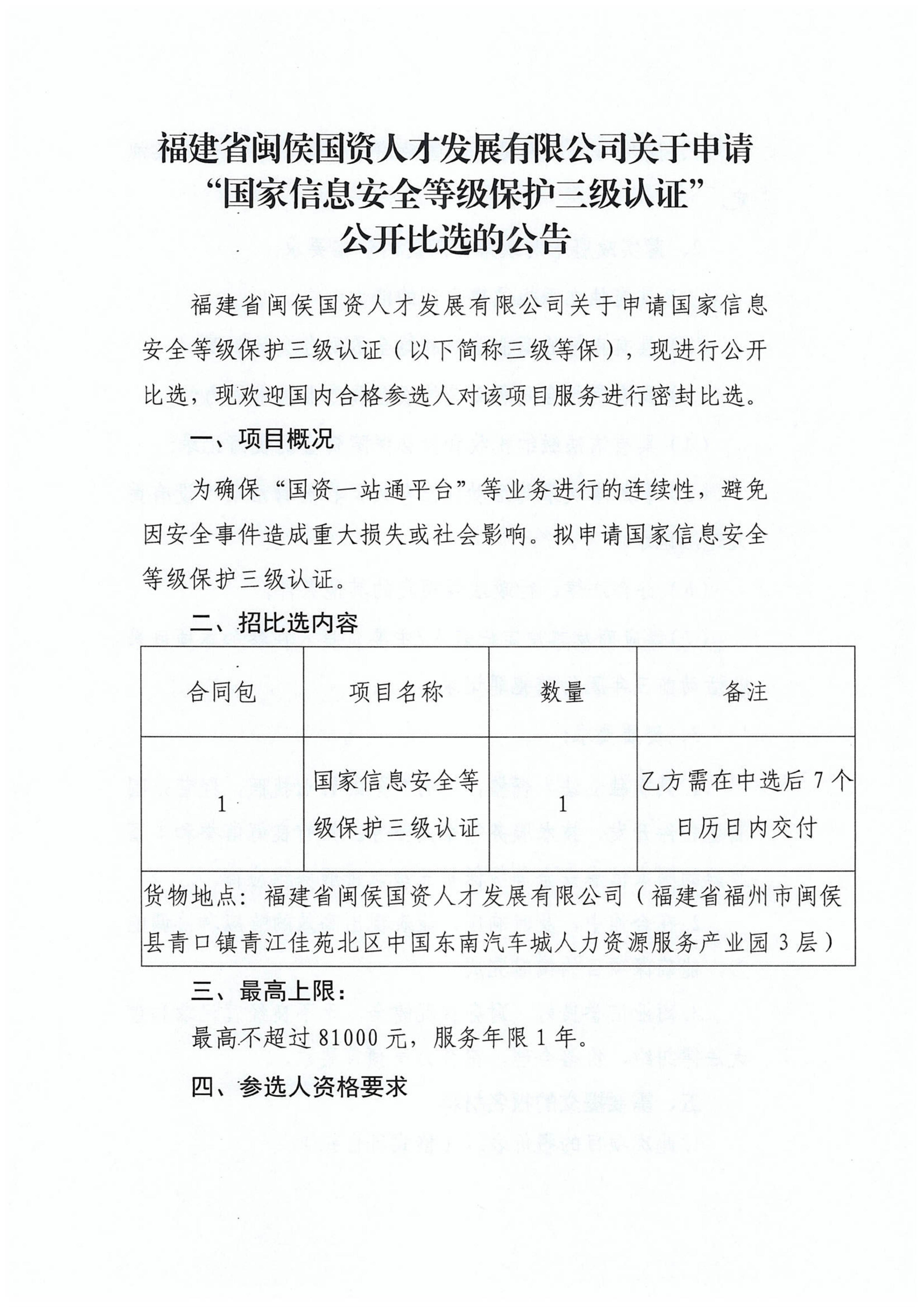 福建省闽侯国资人才发展有限公司关于申请“国家信息安全等级保护三级认证”公开比选的公告