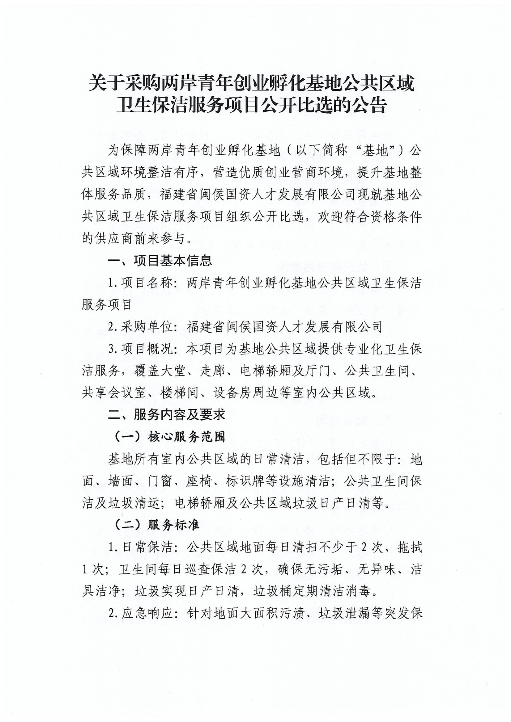 关于采购两岸青年创业孵化基地公共区域卫生保洁服务项目公开比选的公告
