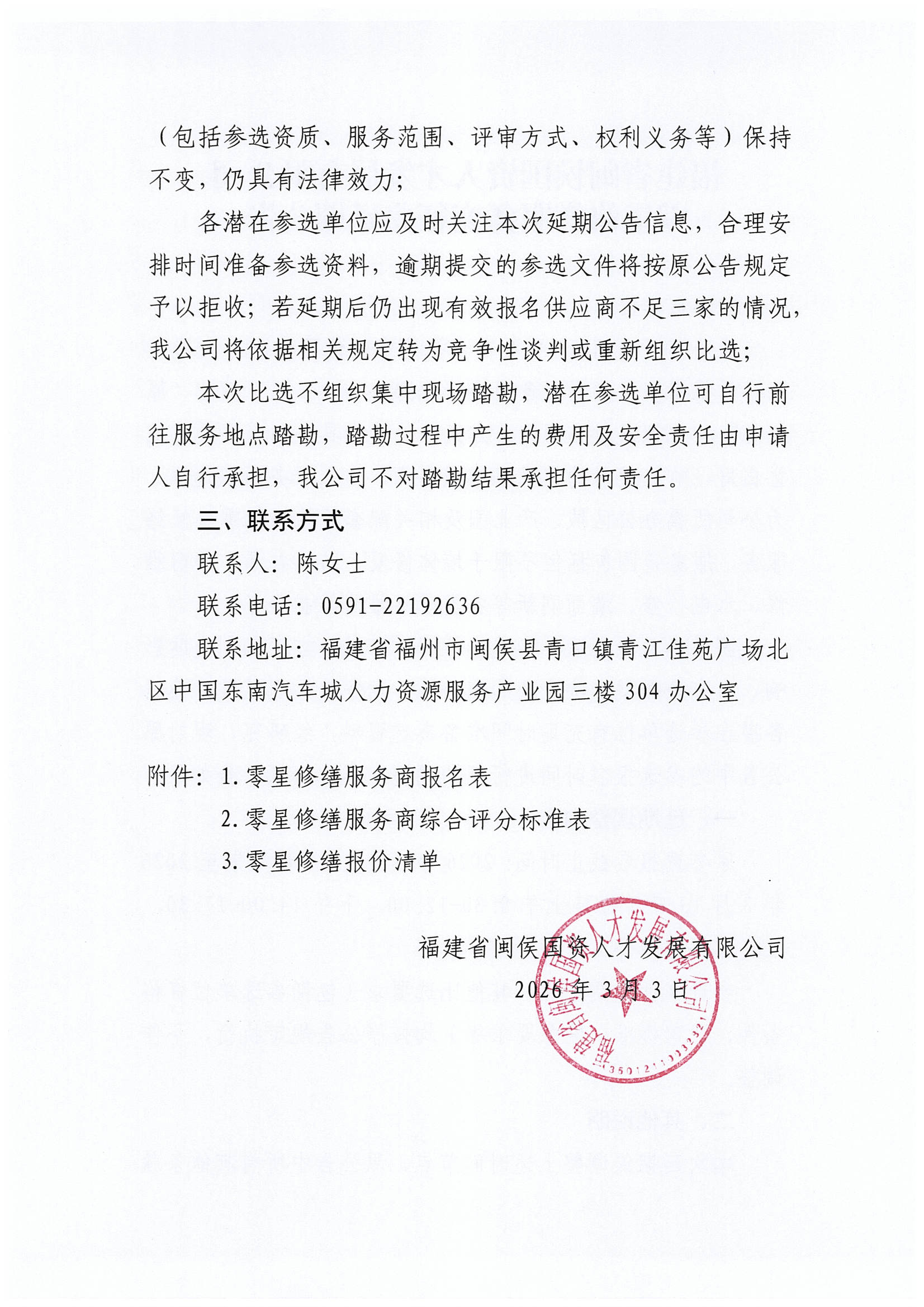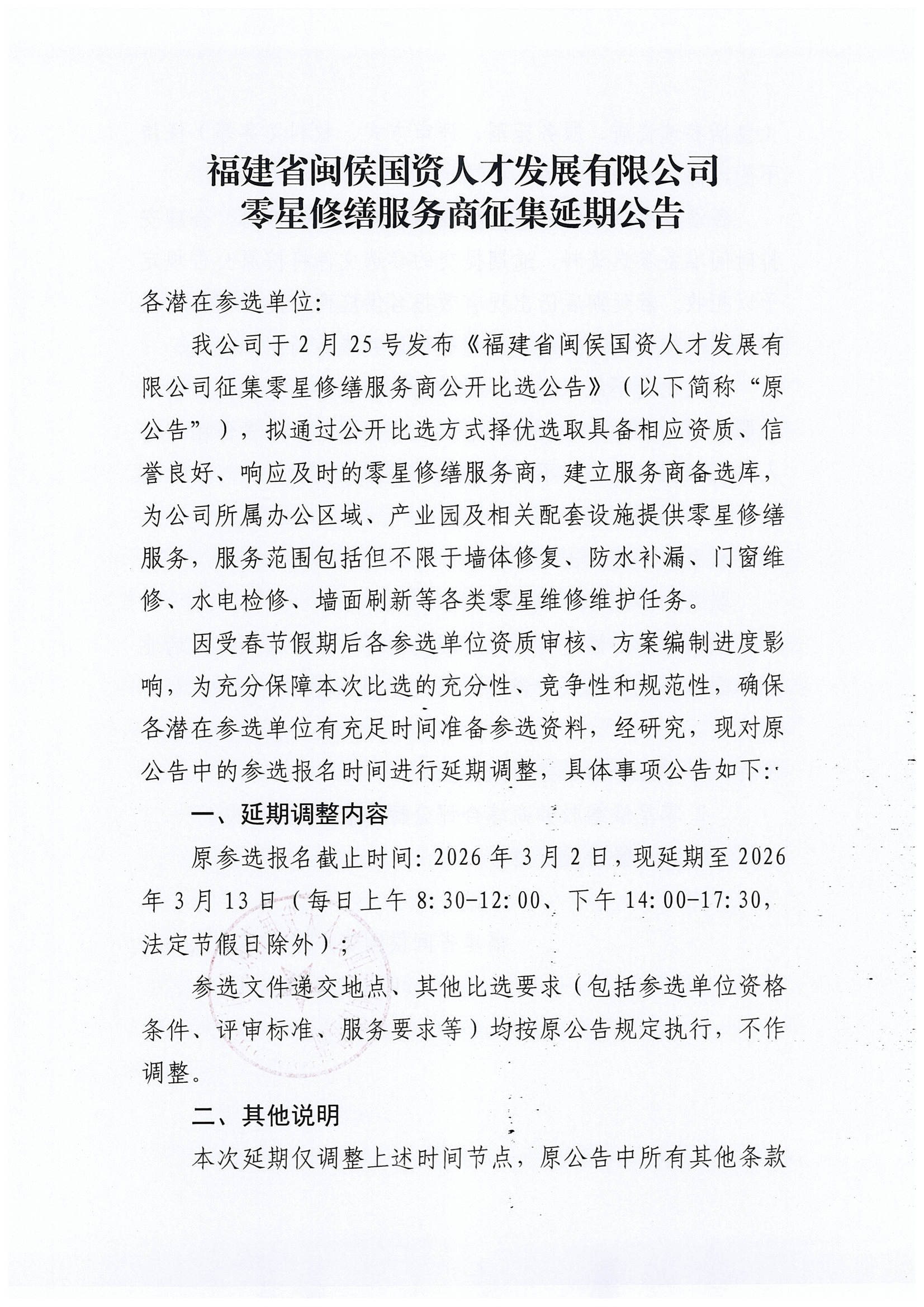 福建省闽侯国资人才发展有限公司零星修缮服务商征集延期公告