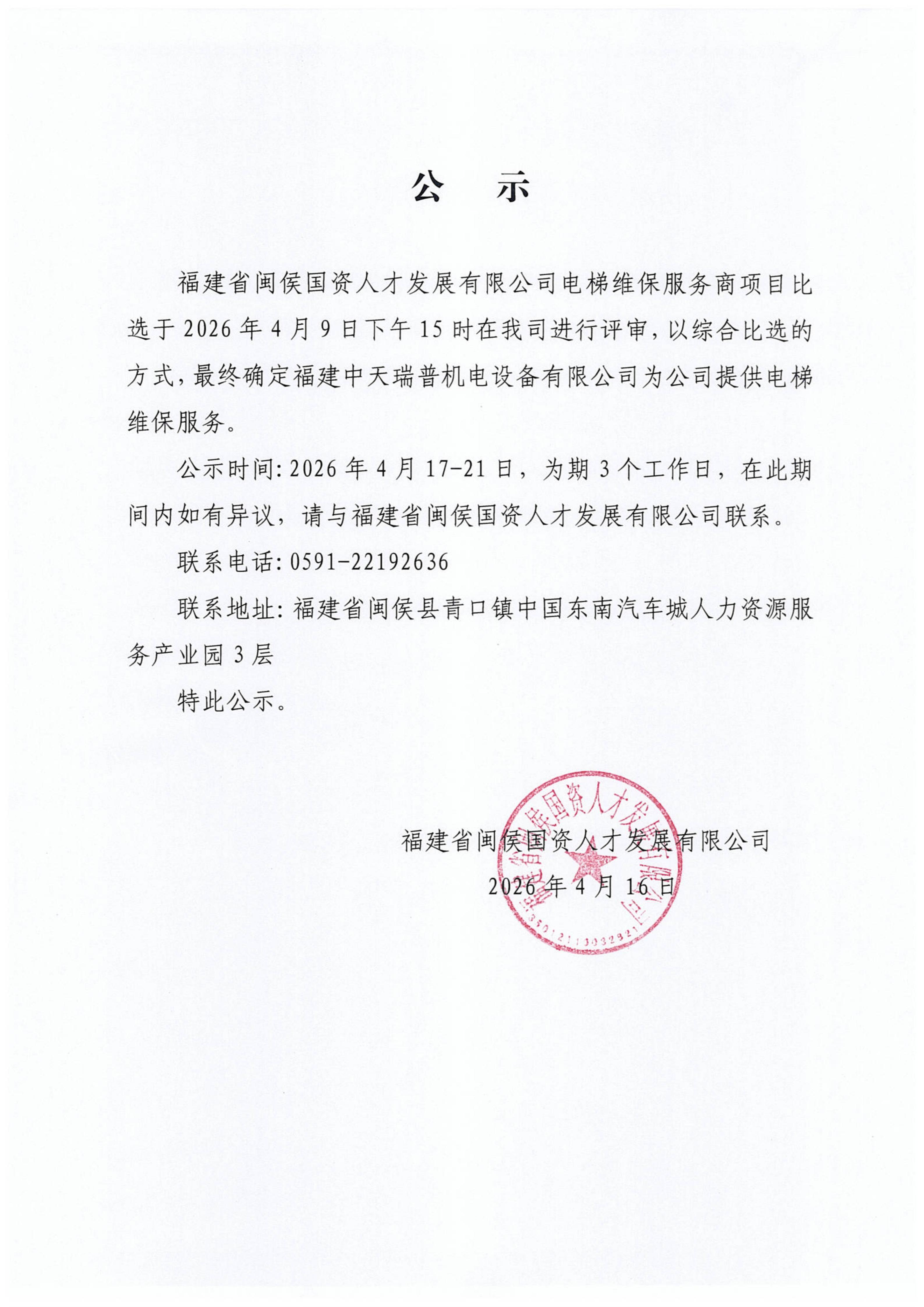 福建省闽侯国资人才发展有限公司关于公开比选电梯维保服务商项目的结果公示