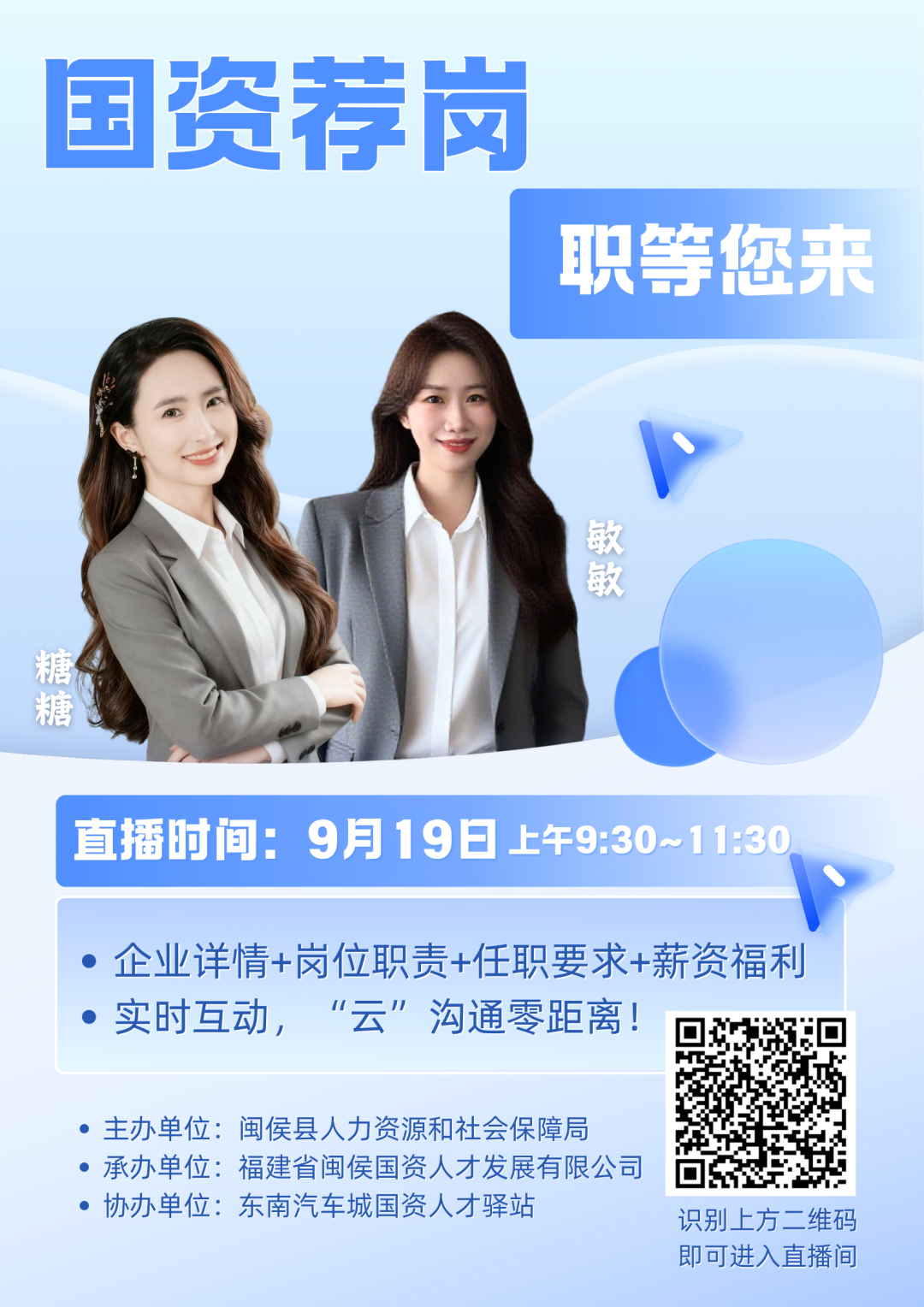 9月19日上午9:30,我们直播间不见不散!好工作,“职”等你来;梦想启航,“职”达彼岸!