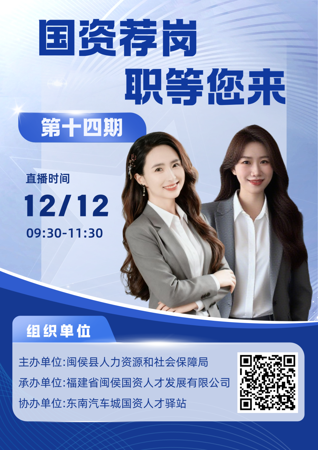 求职的小伙伴看过来!靠谱岗位直送上门啦!12月12日(周五)9:30-11:30,闽侯县人社局牵头的“国资荐岗・职等您来”第十四期直播招聘火热开播!