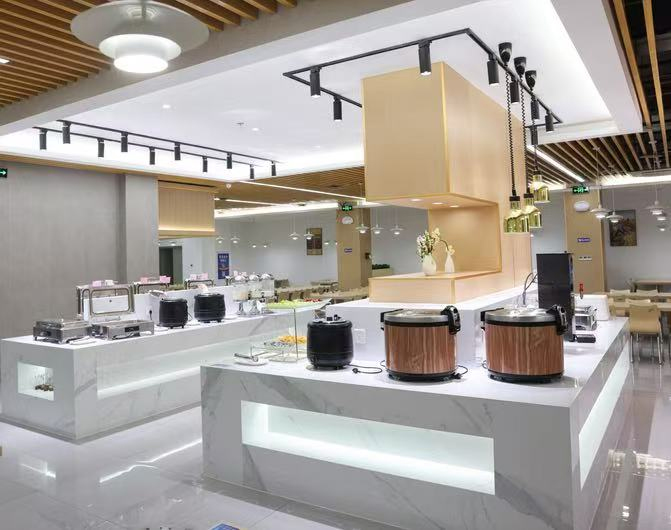 坐落于产业园一层西侧,面积约为440平方米,可同时容纳约130人用餐,可承接各类大型活动的自助餐供应,按预算定制菜品。采用现代简约装修风格,打造出一个舒适、明亮的用餐环境。每日提供早中晚三餐,菜品主要以融合菜为主,丰富多样。