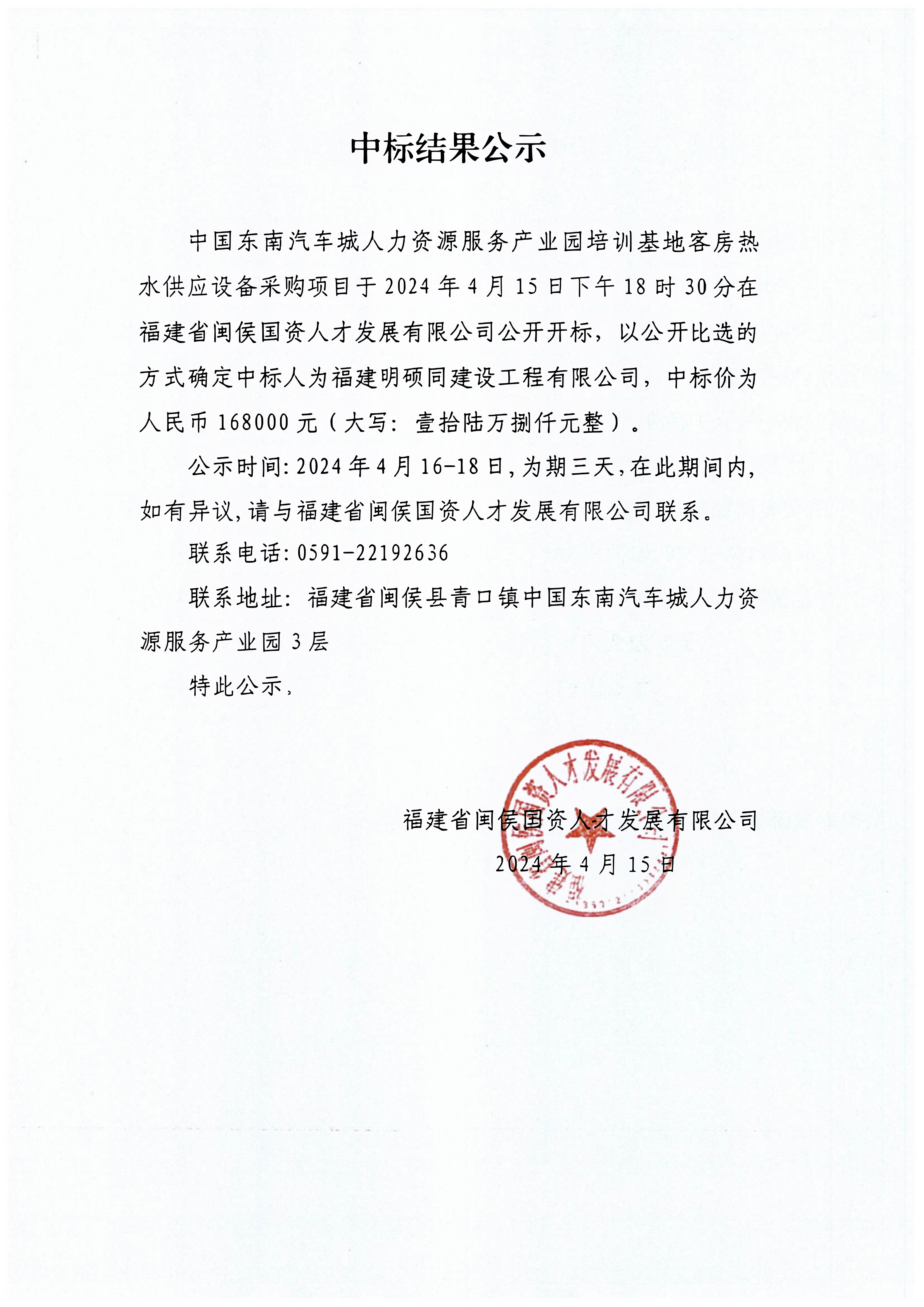 中国东南汽车城人力资源服务产业园培训基地客房热水供应设备采购项目中标结果公示