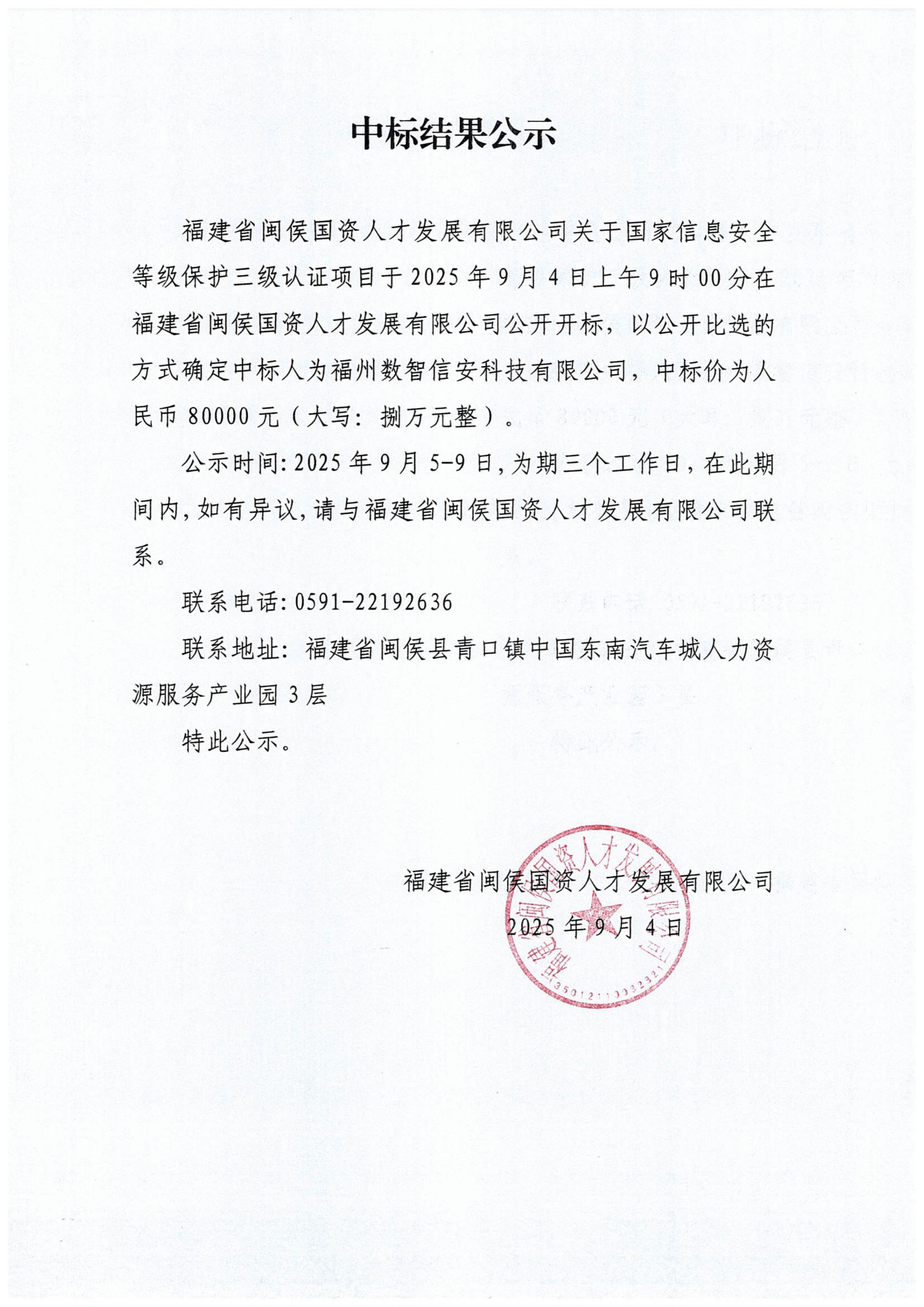 福建省闽侯国资人才发展有限公司关于国家信息安全等级保护三级认证项目中标结果公示