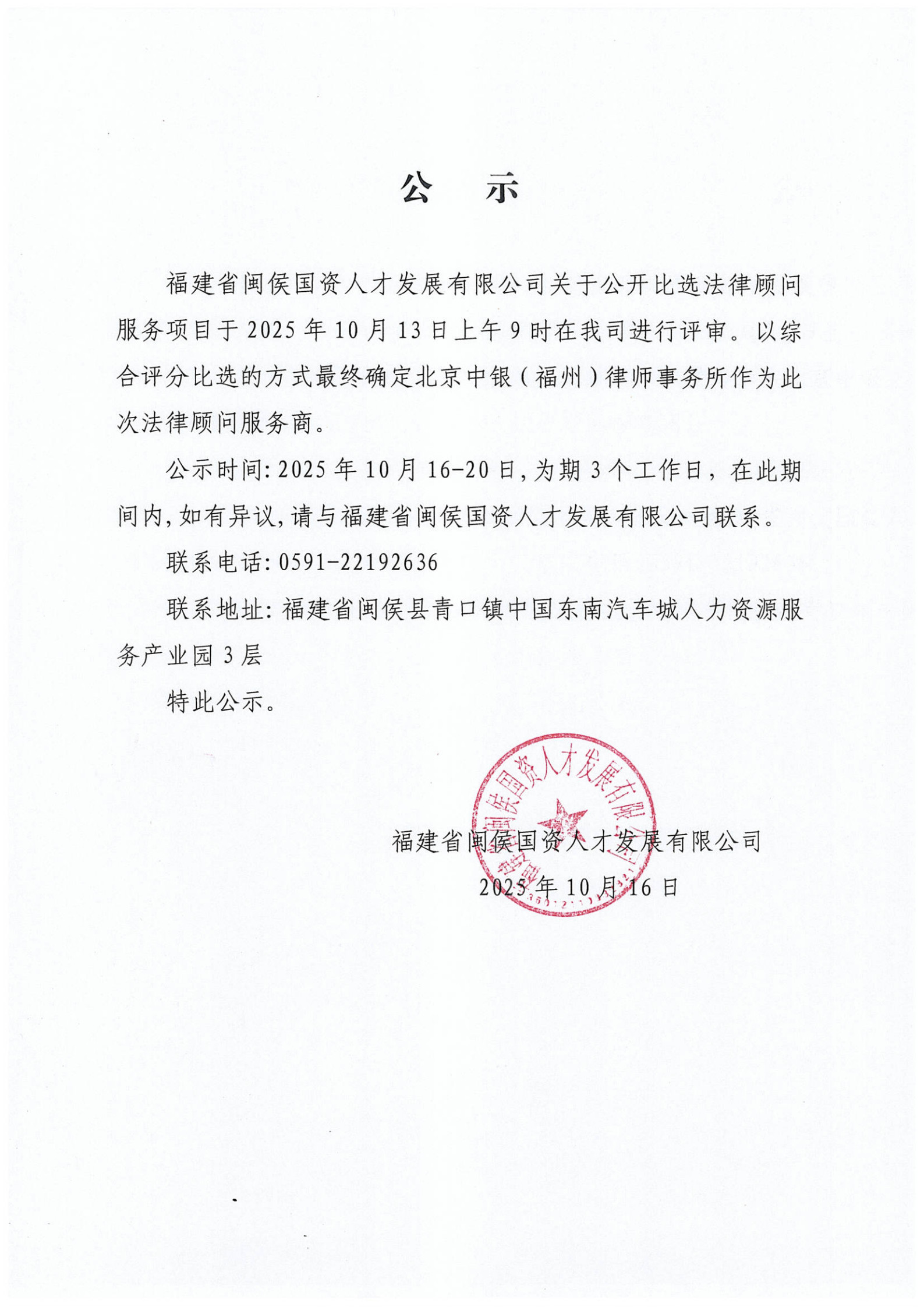 福建省闽侯国资人才发展有限公司关于公开比选法律顾问服务项目中标结果公示