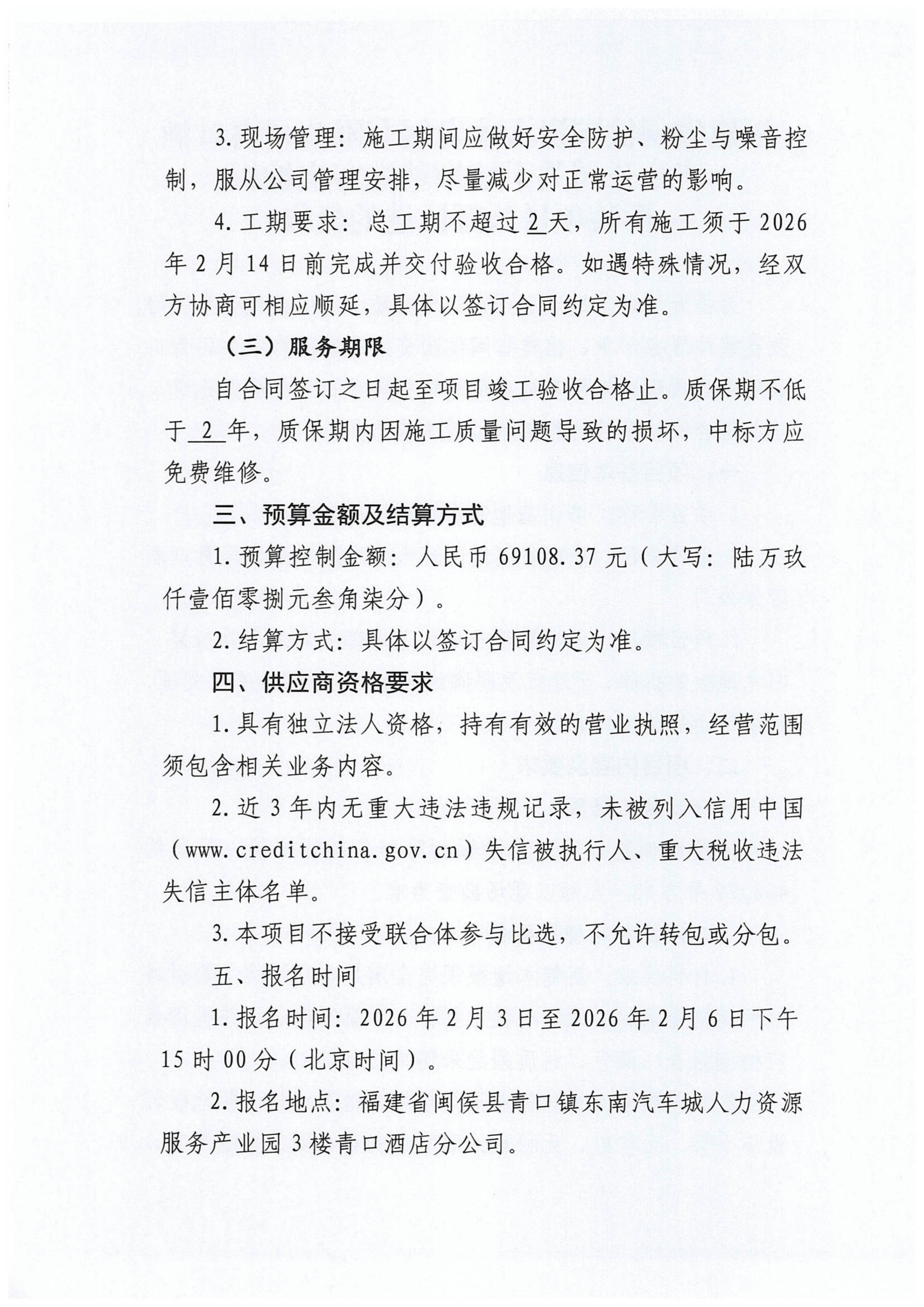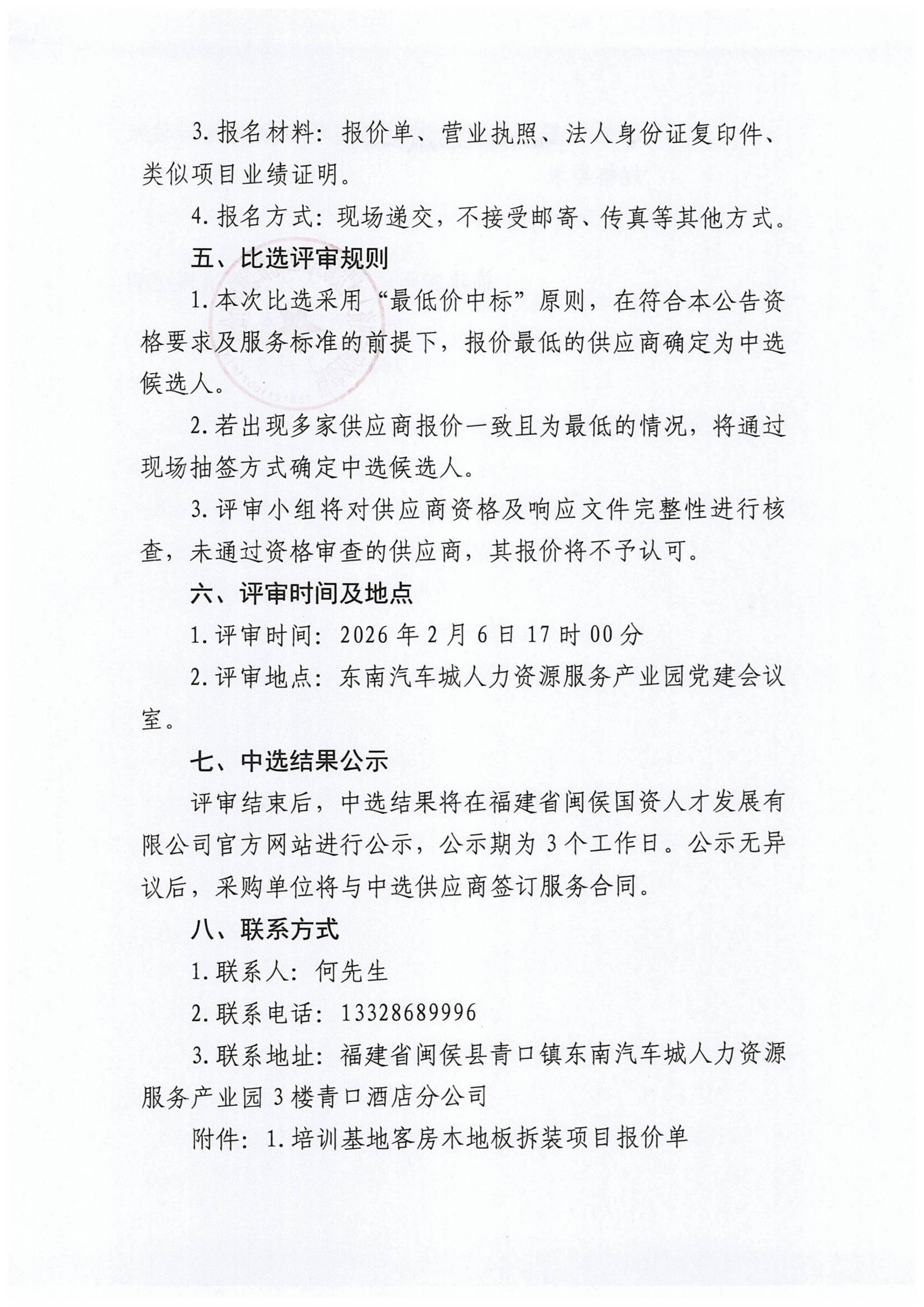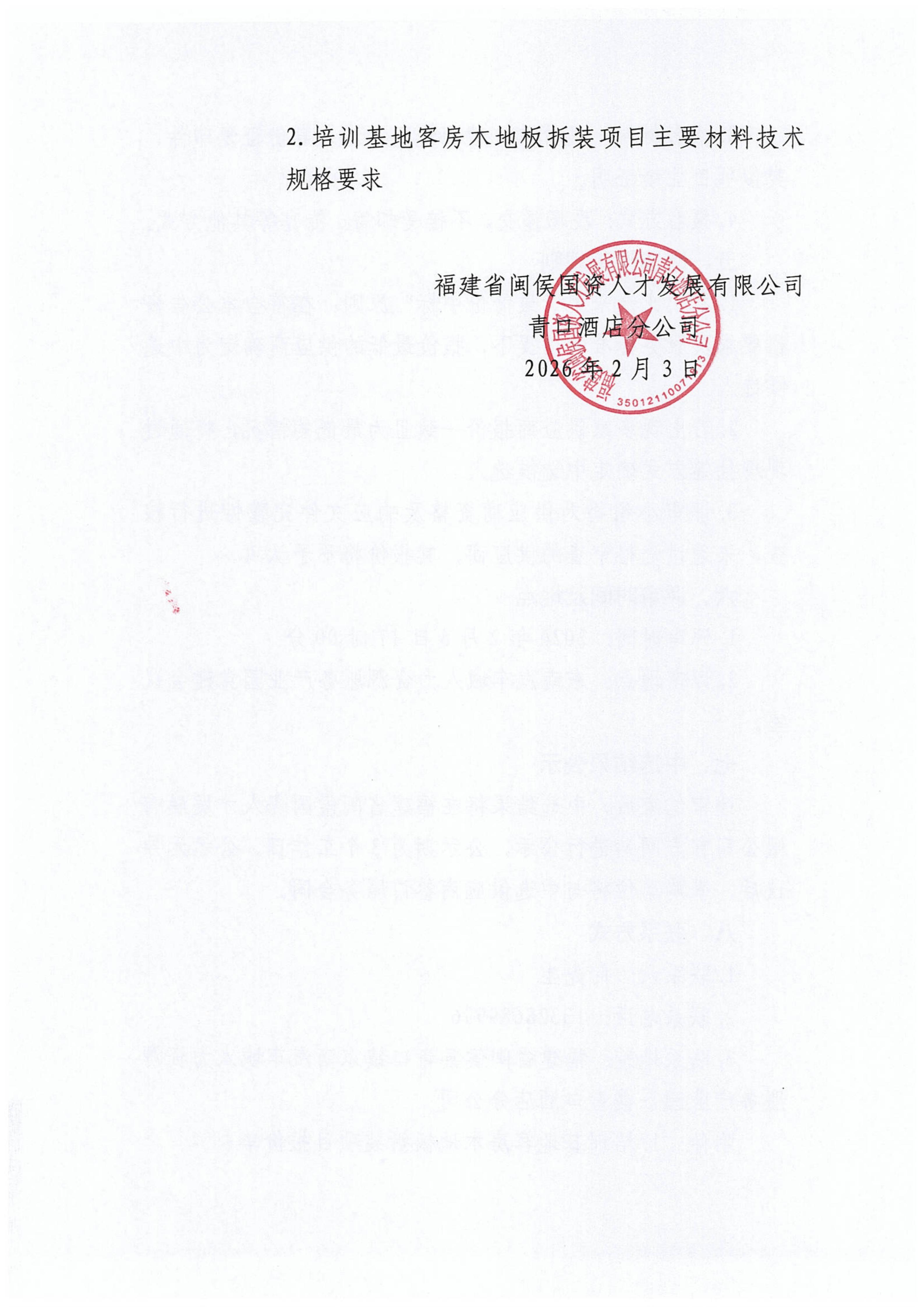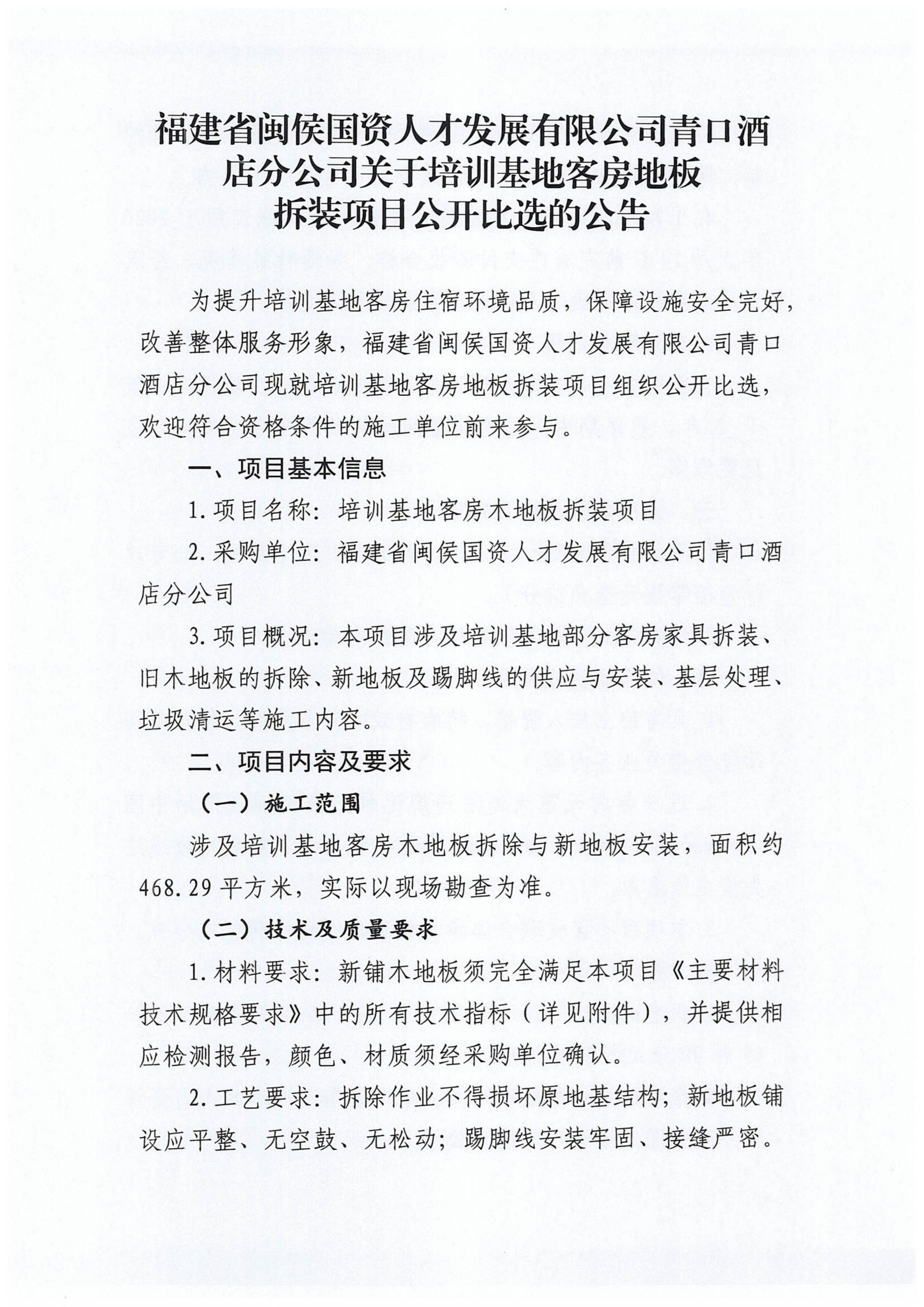 福建省闽侯国资人才发展有限公司青口酒店分公司关于培训基地客房地板拆装项目公开比选的公告