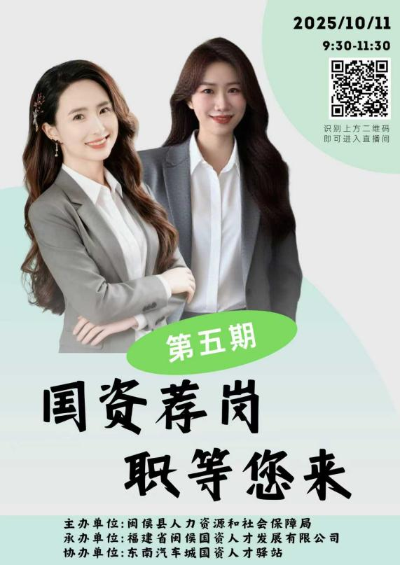 求职者注意!10月11日(星期六)一场重磅招聘直播即将开启!由福建省闽侯国资人才发展有限公司联合多单位共同策划,多家实力企业带来丰富岗位资源,精准匹配不同求职需求,助你轻松拿下心仪offer,定好闹钟,直播间不见不散!