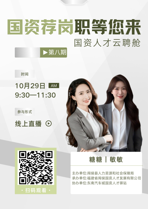 找工作总怕错过好机会?10月29日(周三)的这场招聘直播,就是为你量身定制的“求职快车道”!由福建省闽侯国资人才发展有限公司统筹,携手本地多家信誉单位,带来一批针对性强、适配度高的优质岗位,无论是应届生还是有工作经验的求职者,都能找到适配方向。直播全程专人答疑,帮你扫清求职障碍。